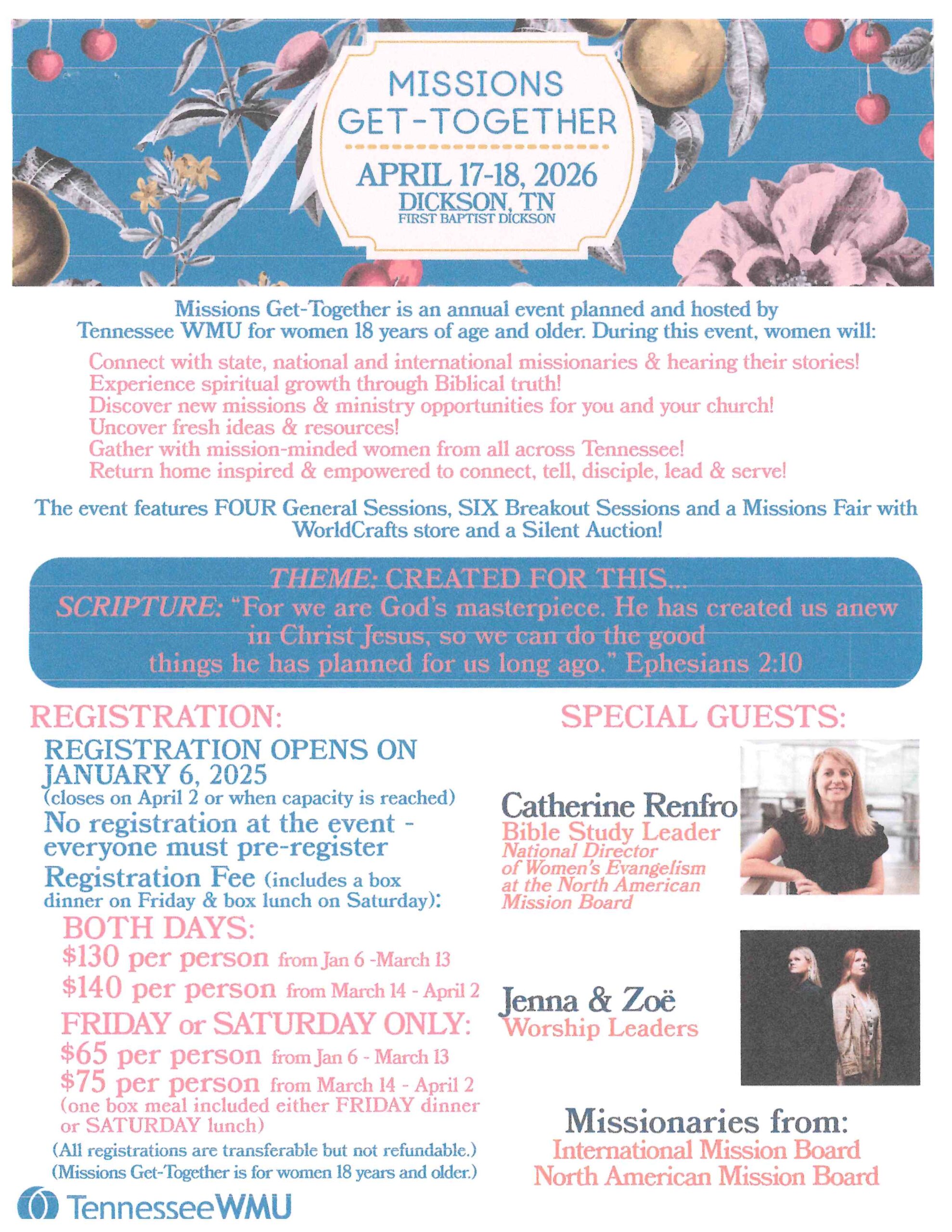 APRIL 17-18: MISSIONS GET-TOGETHER at First Baptist Church, Dickson. Missions Get-Together is an annual event planned and hosted by Tennessee WMU for women 18 and older. Registration opened on January 6 and closes on April 2. No registration at the event – everyone must pre-register. Please see flyer for more information.