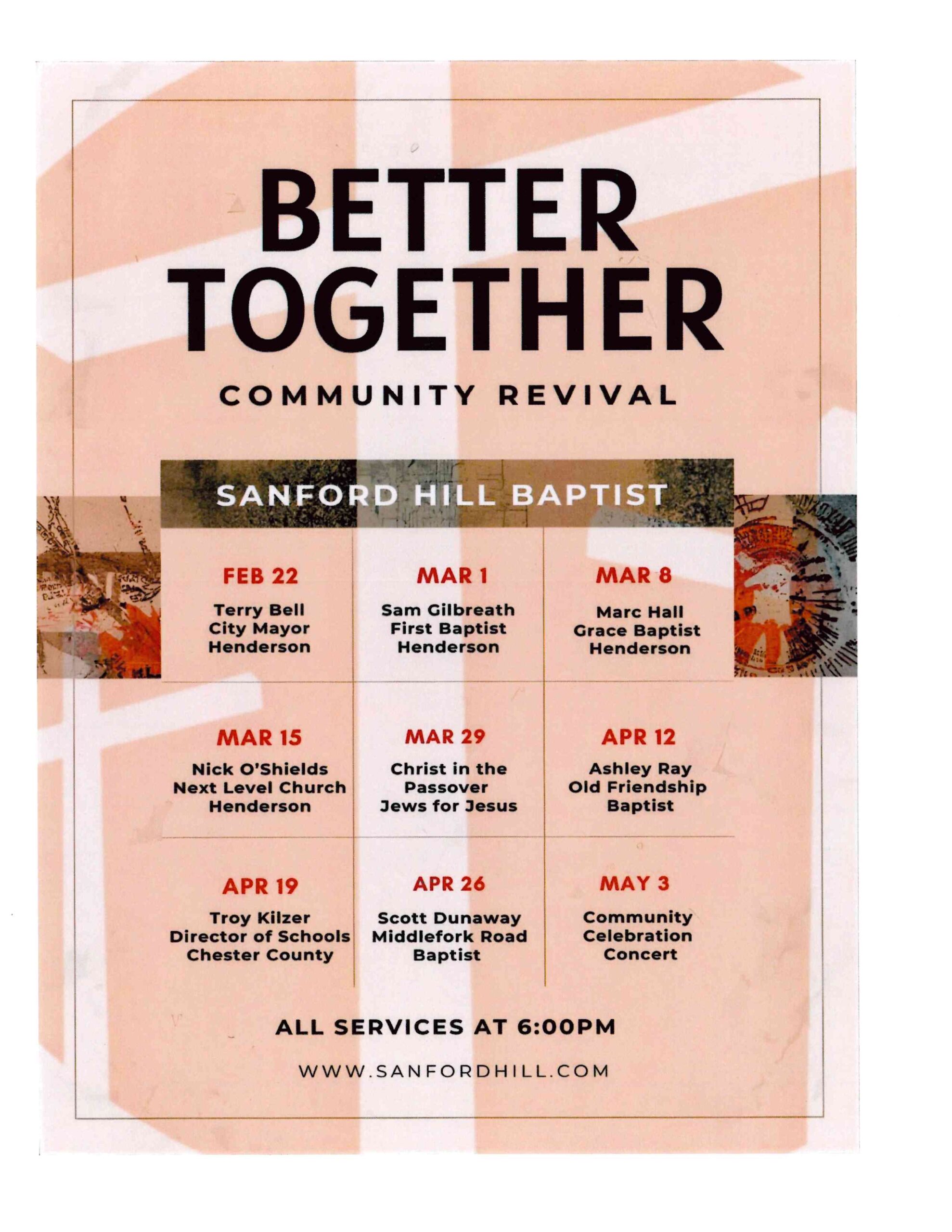 BETTER TOGETHER COMMUNITY REVIVAL at Sanford Hill Baptist, Henderson on Sunday nights at 6:00 p.m. starting February and continuing through May.