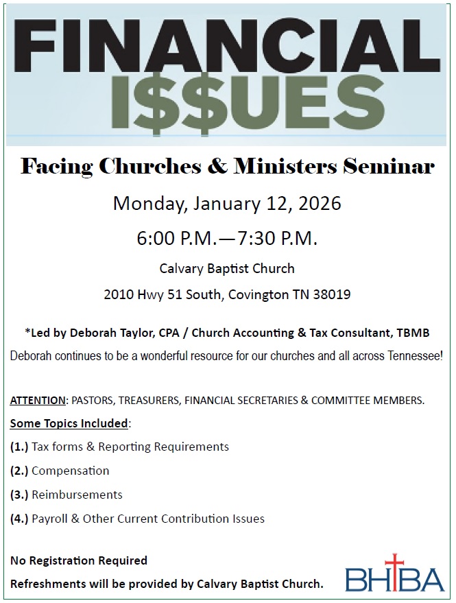 JANUARY 12: FINANCIAL ISSUES at Calvary Baptist Church, Covington from 6:00 p.m. -7:30 p.m. led by Deborah Taylor, CPA/Church Accounting &Tax Consultant, TBMB Post author:Evelyn Gilbert Post published:December 17, 2025 Post category:Larry's Lines / Upcoming Events Post comments:0 Comments Tags: Larry's Lines, Upcoming Events Read more articles Previous PostMadison Chester Crockett’s November 2025 Highlights for the Annual Meetings You Might Also Like FEBRUARY 22: RHETT WALKER IN CONCERT at Poplar Heights Baptist Church, Jackson February 12, 2025 Madison-Chester and Crockett’s Asembo Bay’s Orphans, Vulnerable Children, and Widows’ Project June 6, 2023 Madison-Chester Association Senior Adult Meeting: March 19, 2024 at 10:30 a.m. with lunch to follow at Parkburg Baptist Church, Pinson NOTE: No Crockett Senior Adult Meeting in March January 31, 2024 Leave a Reply Cancel replyYou must be logged in to post a comment.