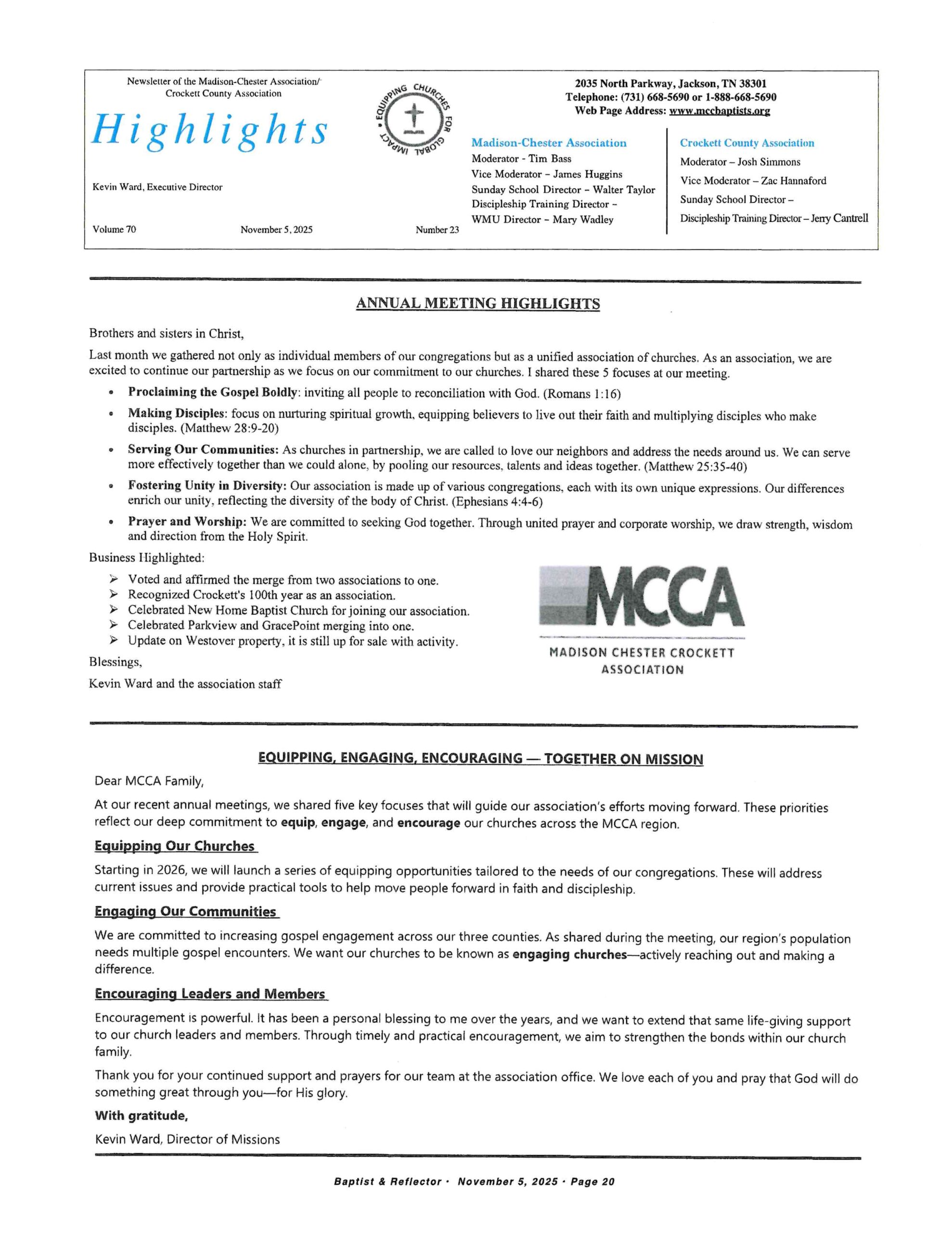 Madison Chester Crockett’s November 2025 Highlights for the Annual Meetings Post author:Evelyn Gilbert Post published:December 4, 2025 Post category:Larry's Lines Post comments:0 Comments Tags: Larry's Lines Read more articles Previous PostDECEMBER 7: LIVE LIKE JESUS – Men’s Night of Worship at Meridian Baptist Church, Jackson. You Might Also Like Children’s Ministry Training Conference: August 17, 2024 at Woodland Baptist Church, Jackson from 8:00 a.m. – 1:30 p.m. August 6, 2024 Senior Adult Extravaganza: Thursday, August 4, 2022 at 1:00 p.m. – 4:30 p.m. at Union University’s G.M. Savage Memorial Chapel July 13, 2022 MM1D (Medical Missions One Day): April 22, 2023 at Calvary Baptist Church, Jackson from 9:00 a.m. – 4:00 p.m. with lunch provided February 8, 2023 Leave a Reply Cancel replyYou must be logged in to post a comment.