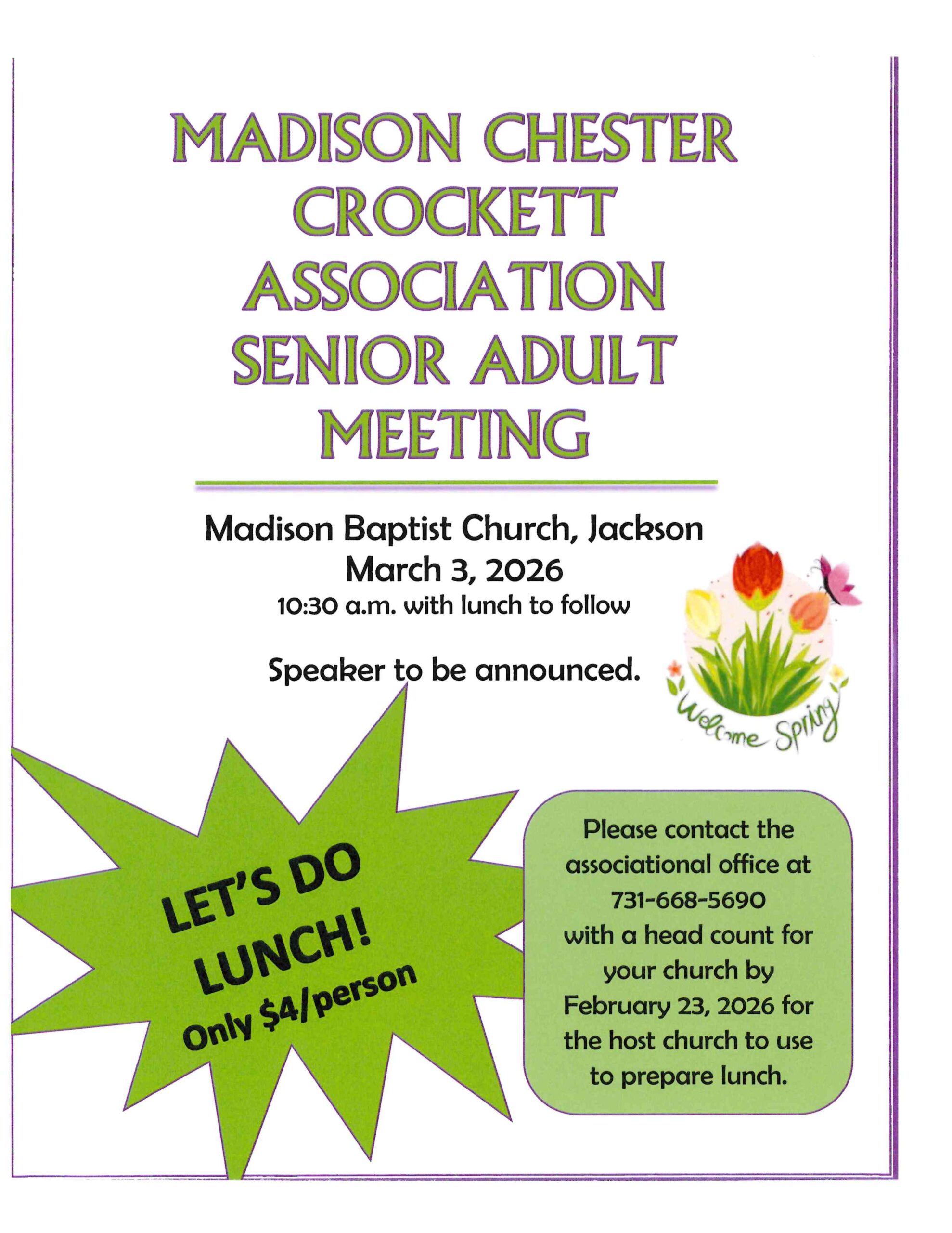 Please contact the associational office at 731-668-5690 with a head count for your church by February 23 for the host church to use to prepare lunch. Clay Gilbreath, Director of Missions, Big Hatchie Baptist Association will be the speaker. Lunch is $4 per person.