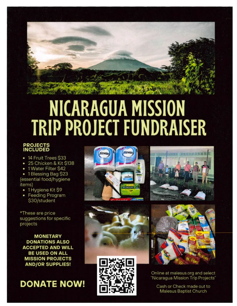 MAY 29 – JUNE 6: Malesus Baptist Church, Jackson will be going on a mission trip to Nicaragua from May 29 – June 6. They would appreciate your help supporting their Nicaragua Mission Team! Post author:Evelyn Gilbert Post published:March 4, 2026 Post category:News / Upcoming Events Post comments:0 Comments If you are interested in supporting their Mission Trip to Nicaragua, please see the attached flyer to donate towards various trip projects. Tags: Larry's Lines, Upcoming Events Read more articles Previous PostJune 2: Madison Chester Crockett Senior Adult Meeting, First Baptist Church, Alamo You Might Also Like OCTOBER 3 – OCTOBER 15: COLLECTION OF ITEMS FOR VICTIMS OF HURRICANE HELENE AT WEST JACKSON BAPTIST CHURCH, JACKSON October 3, 2024 Newsletter – January 2020 January 27, 2020 All Nations Camp 2023 is for elementary through high-school aged students, ages 6-17, from ethnic congregations of the Tennessee Baptist Convention. February 27, 2023 Leave a Reply Cancel replyYou must be logged in to post a comment.